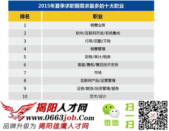 圖為2015年夏季求職期需求最多的十大職業(yè),也就是目前比較稀缺人才的行業(yè),有些職業(yè)是企業(yè)之中不可或缺的職位,有些職位則是由于行業(yè)的蓬勃發(fā)展而不斷增加的職位。總之,這些職位決定你未來做什么,選擇時一定要慎之又慎。